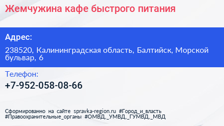 Жемчужина, кафе быстрого питания по адресу 238520, Калининградская область, Балтийск, Морской бульвар, 6 в дальнейшем Организация, размещена в следующих категориях: