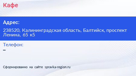 Кафе по адресу 238520, Калининградская область, Балтийск, проспект Ленина, 65 к5 в дальнейшем Организация, размещена в следующих категориях: