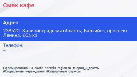Смак, кафе по адресу 238520, Калининградская область, Балтийск, проспект Ленина, 60а к1 в дальнейшем Организация, размещена в следующих категориях: