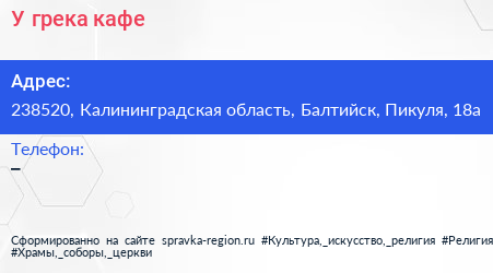 У грека, кафе по адресу 238520, Калининградская область, Балтийск, Пикуля, 18а в дальнейшем Организация, размещена в следующих категориях: