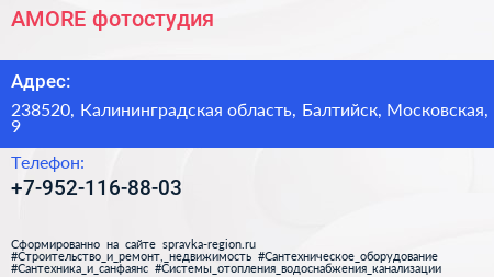 AMORE, фотостудия по адресу 238520, Калининградская область, Балтийск, Московская, 9 в дальнейшем Организация, размещена в следующих категориях: