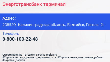 Энерготрансбанк, терминал по адресу 238520, Калининградская область, Балтийск, Гоголя, 2г в дальнейшем Организация, размещена в следующих категориях: