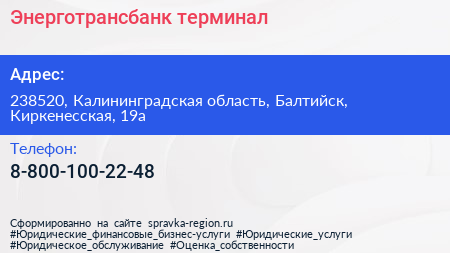 Энерготрансбанк, терминал по адресу 238520, Калининградская область, Балтийск, Киркенесская, 19а в дальнейшем Организация, размещена в следующих категориях: