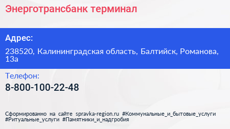 Энерготрансбанк, терминал по адресу 238520, Калининградская область, Балтийск, Романова, 13а в дальнейшем Организация, размещена в следующих категориях: