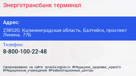 Энерготрансбанк, терминал по адресу 238520, Калининградская область, Балтийск, проспект Ленина, 77Б в дальнейшем Организация, размещена в следующих категориях: