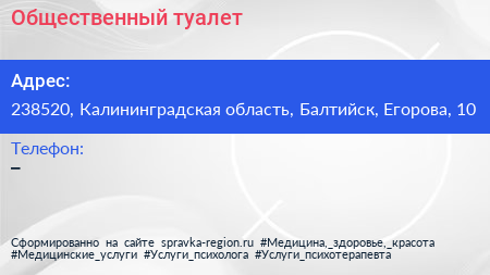 Общественный туалет по адресу 238520, Калининградская область, Балтийск, Егорова, 10 в дальнейшем Организация, размещена в следующих категориях: