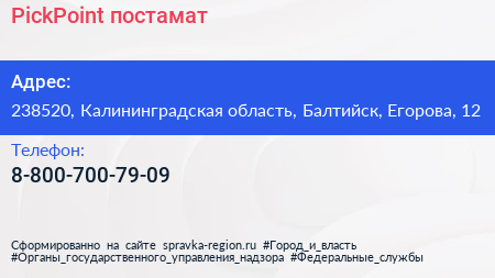 PickPoint, постамат по адресу 238520, Калининградская область, Балтийск, Егорова, 12 в дальнейшем Организация, размещена в следующих категориях:
