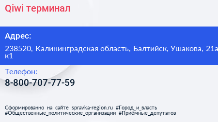 Qiwi, терминал по адресу 238520, Калининградская область, Балтийск, Ушакова, 21а к1 в дальнейшем Организация, размещена в следующих категориях: