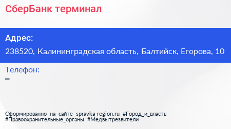 СберБанк, терминал по адресу 238520, Калининградская область, Балтийск, Егорова, 10 в дальнейшем Организация, размещена в следующих категориях: