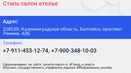 Стиль, салон-ателье по адресу 238520, Калининградская область, Балтийск, проспект Ленина, 62Б в дальнейшем Организация, размещена в следующих категориях: