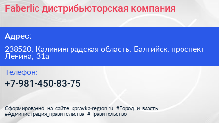 Faberlic, дистрибьюторская компания по адресу 238520, Калининградская область, Балтийск, проспект Ленина, 31а в дальнейшем Организация, размещена в следующих категориях: