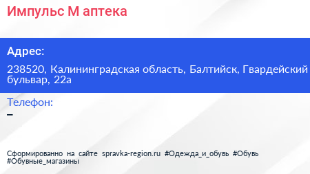 Импульс М, аптека по адресу 238520, Калининградская область, Балтийск, Гвардейский бульвар, 22а в дальнейшем Организация, размещена в следующих категориях:
