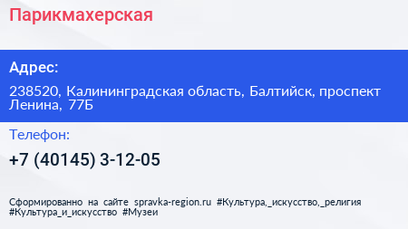 Парикмахерская по адресу 238520, Калининградская область, Балтийск, проспект Ленина, 77Б в дальнейшем Организация, размещена в следующих категориях: