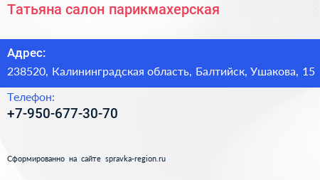 Татьяна, салон-парикмахерская по адресу 238520, Калининградская область, Балтийск, Ушакова, 15 в дальнейшем Организация, размещена в следующих категориях: