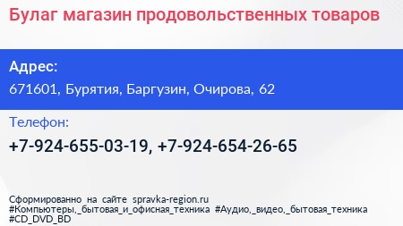 Булаг, магазин продовольственных товаров по адресу 671601, Бурятия, Баргузин, Очирова, 62 в дальнейшем Организация, размещена в следующих категориях: