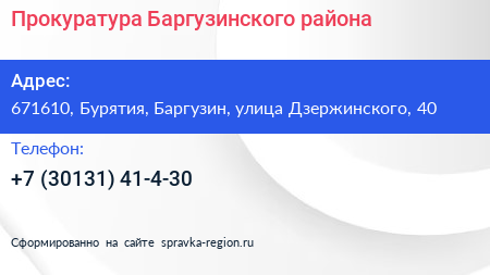Прокуратура Баргузинского района по адресу 671610, Бурятия, Баргузин, улица Дзержинского, 40 в дальнейшем Организация, размещена в следующих категориях:
