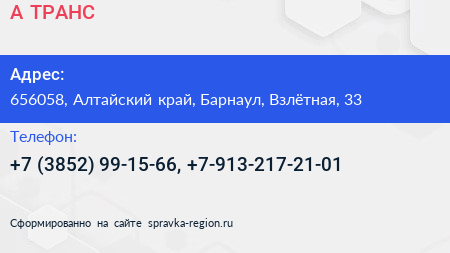А-ТРАНС по адресу 656058, Алтайский край, Барнаул, Взлётная, 33 в дальнейшем Организация, размещена в следующих категориях: