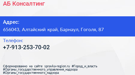АБ-Консалтинг по адресу 656043, Алтайский край, Барнаул, Гоголя, 87 в дальнейшем Организация, размещена в следующих категориях: