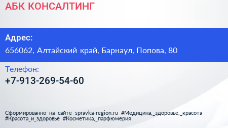 АБК КОНСАЛТИНГ по адресу 656062, Алтайский край, Барнаул, Попова, 80 в дальнейшем Организация, размещена в следующих категориях: