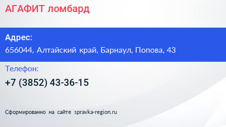 АГАФИТ, ломбард по адресу 656044, Алтайский край, Барнаул, Попова, 43 в дальнейшем Организация, размещена в следующих категориях: