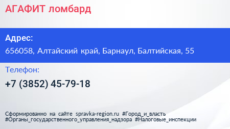 АГАФИТ, ломбард по адресу 656058, Алтайский край, Барнаул, Балтийская, 55 в дальнейшем Организация, размещена в следующих категориях: