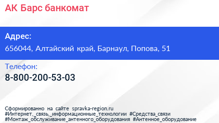 АК Барс, банкомат по адресу 656044, Алтайский край, Барнаул, Попова, 51 в дальнейшем Организация, размещена в следующих категориях: