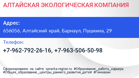 АЛТАЙСКАЯ ЭКОЛОГИЧЕСКАЯ КОМПАНИЯ по адресу 656056, Алтайский край, Барнаул, Пушкина, 29 в дальнейшем Организация, размещена в следующих категориях: