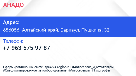 АНАДО по адресу 656056, Алтайский край, Барнаул, Пушкина, 32 в дальнейшем Организация, размещена в следующих категориях: