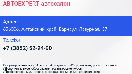 АВТОEXPERT, автосалон по адресу 656006, Алтайский край, Барнаул, Лазурная, 37 в дальнейшем Организация, размещена в следующих категориях: