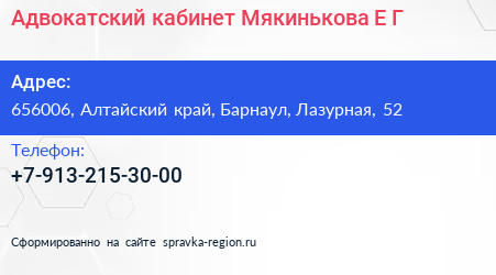 Адвокатский кабинет Мякинькова Е.Г. по адресу 656006, Алтайский край, Барнаул, Лазурная, 52 в дальнейшем Организация, размещена в следующих категориях: