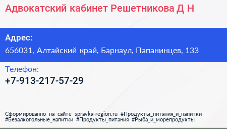 Адвокатский кабинет Решетникова Д.Н. по адресу 656031, Алтайский край, Барнаул, Папанинцев, 133 в дальнейшем Организация, размещена в следующих категориях: