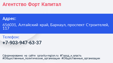 Агентство Форт Капитал по адресу 656031, Алтайский край, Барнаул, проспект Строителей, 117 в дальнейшем Организация, размещена в следующих категориях: