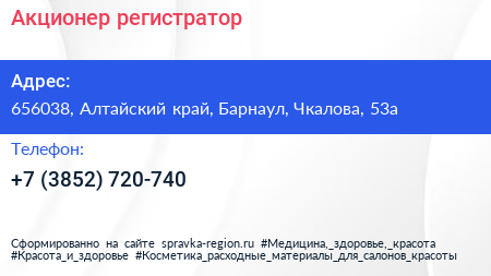 Акционер, регистратор по адресу 656038, Алтайский край, Барнаул, Чкалова, 53а в дальнейшем Организация, размещена в следующих категориях: