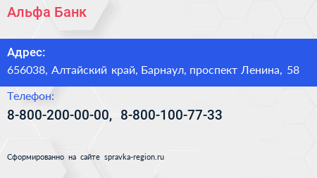 Альфа-Банк по адресу 656038, Алтайский край, Барнаул, проспект Ленина, 58 в дальнейшем Организация, размещена в следующих категориях: