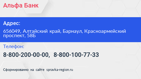 Альфа-Банк по адресу 656049, Алтайский край, Барнаул, Красноармейский проспект, 58Б в дальнейшем Организация, размещена в следующих категориях: