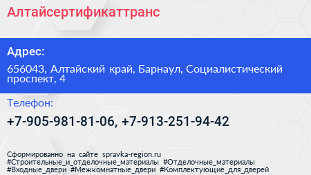Алтайсертификаттранс по адресу 656043, Алтайский край, Барнаул, Социалистический проспект, 4 в дальнейшем Организация, размещена в следующих категориях:
