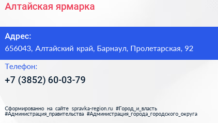 Алтайская ярмарка по адресу 656043, Алтайский край, Барнаул, Пролетарская, 92 в дальнейшем Организация, размещена в следующих категориях: