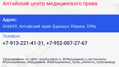 Алтайский центр медицинского права по адресу 656019, Алтайский край, Барнаул, Юрина, 194а в дальнейшем Организация, размещена в следующих категориях: