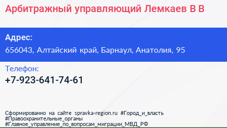 Арбитражный управляющий Лемкаев В.В. по адресу 656043, Алтайский край, Барнаул, Анатолия, 95 в дальнейшем Организация, размещена в следующих категориях: