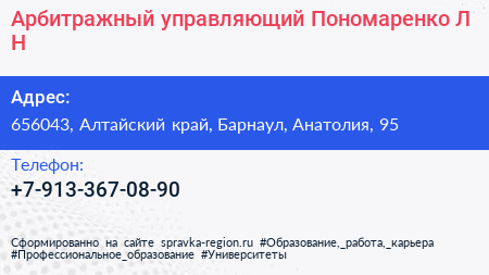 Арбитражный управляющий Пономаренко Л.Н. по адресу 656043, Алтайский край, Барнаул, Анатолия, 95 в дальнейшем Организация, размещена в следующих категориях: