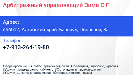 Арбитражный управляющий Зима С.Г. по адресу 656002, Алтайский край, Барнаул, Пионеров, 8а в дальнейшем Организация, размещена в следующих категориях: