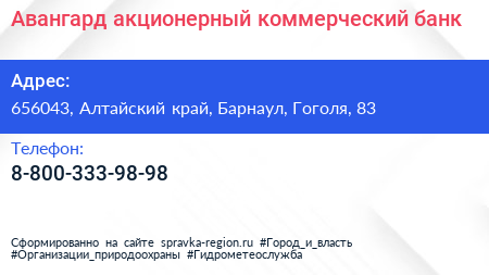 Авангард, акционерный коммерческий банк по адресу 656043, Алтайский край, Барнаул, Гоголя, 83 в дальнейшем Организация, размещена в следующих категориях: