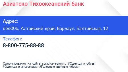 Азиатско-Тихоокеанский банк по адресу 656006, Алтайский край, Барнаул, Балтийская, 12 в дальнейшем Организация, размещена в следующих категориях: