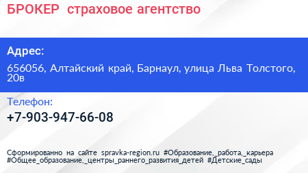БРОКЕР+, страховое агентство по адресу 656056, Алтайский край, Барнаул, улица Льва Толстого, 20в в дальнейшем Организация, размещена в следующих категориях: