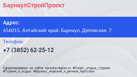 БарнаулСтройПроект по адресу 656015, Алтайский край, Барнаул, Деповская, 7 в дальнейшем Организация, размещена в следующих категориях: