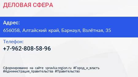ДЕЛОВАЯ СФЕРА по адресу 656058, Алтайский край, Барнаул, Взлётная, 35 в дальнейшем Организация, размещена в следующих категориях: