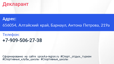 Декларант по адресу 656054, Алтайский край, Барнаул, Антона Петрова, 219а в дальнейшем Организация, размещена в следующих категориях: