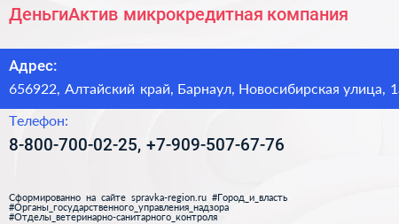 ДеньгиАктив, микрокредитная компания по адресу 656922, Алтайский край, Барнаул, Новосибирская улица, 1а в дальнейшем Организация, размещена в следующих категориях: