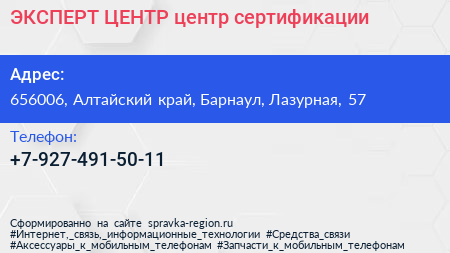 ЭКСПЕРТ ЦЕНТР, центр сертификации по адресу 656006, Алтайский край, Барнаул, Лазурная, 57 в дальнейшем Организация, размещена в следующих категориях: