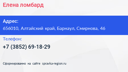 Елена, ломбард по адресу 656010, Алтайский край, Барнаул, Смирнова, 46 в дальнейшем Организация, размещена в следующих категориях: